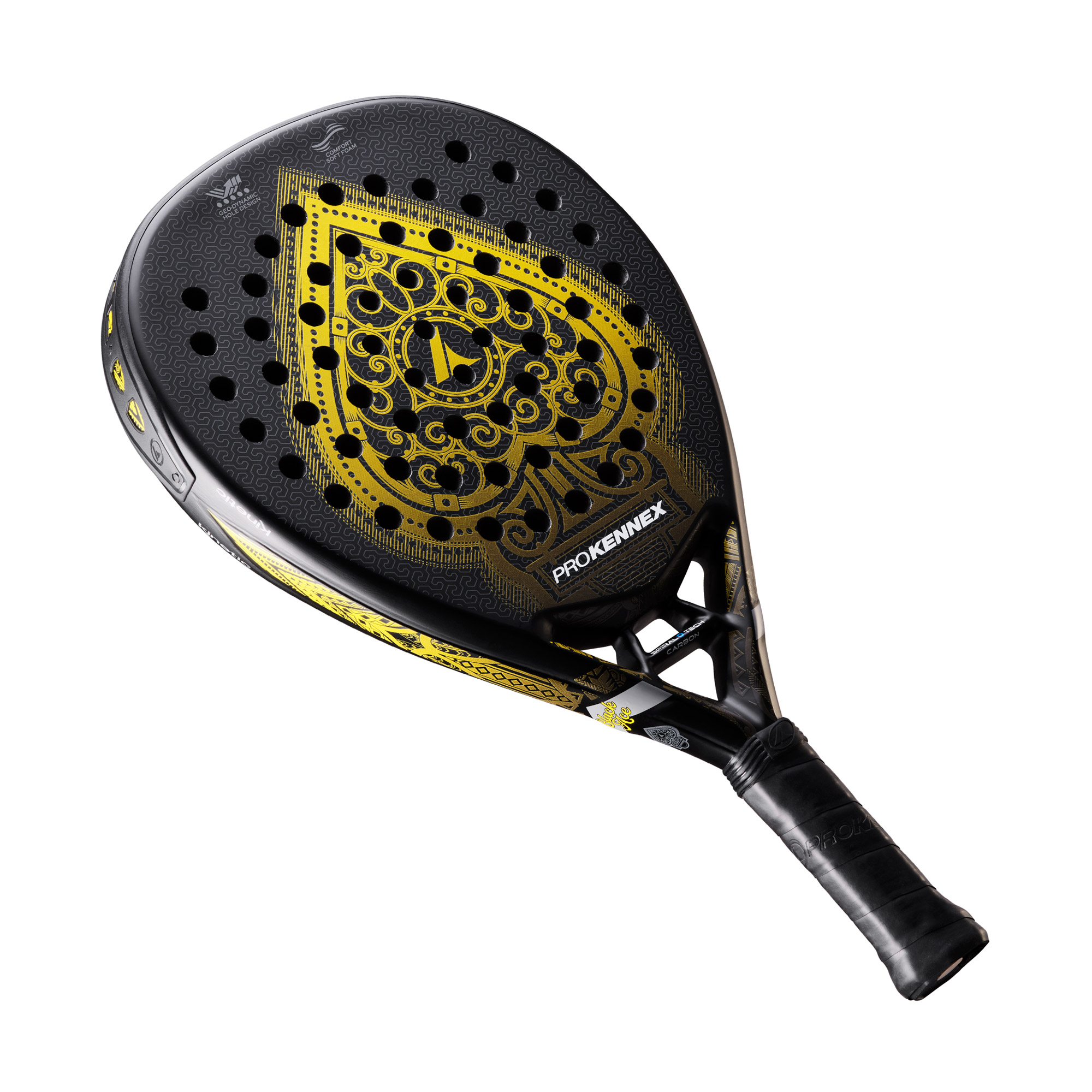 Легендарная ракетка PROKENNEX из Серии BLACK ACE теперь и в Паделе. Разработана специально для атакующих игроков, сочетает в себе фантастические игровые ощущения, смертельные удары по мячу, достойные самых требовательных пользователей: – Бриллиантовая форма головки ракетки – управляемая мощь и энергия ваших ударов – 3 слоя карбона, выполненные по технологии Spiral Tech Carbon – Фактурная технология 3D Grain Surface и отверстия произведенные по технологии Geo-Dinamic Hole Design придает мячу смертельное вращение и лучший контроль – Новый материал Soft EVA жесткостью 16° – Эксклюзивная А-образная форма шейки ракетки PK-Bridge гарантирует надежность при всех ударах – Встроенная в ракетку система Kinetic System стабилизирует корпус во время ударов, обеспечивая максимальную точность, гашение вредных вибраций и чистоту удара. – Бампер из ПВХ предназначен для защиты головки ракетки без слишком сильного смещения баланса – Кинетическая демпфирующая камера в рукоятке забирает полностью вредную вибрацию, обеспечивая надежный и удобный хват Длина ракетки: 455 мм Профиль: 38 мм Вес: 370 гр Баланс: 270 мм Гибкость: 61 Ракетка поставляется в чехле